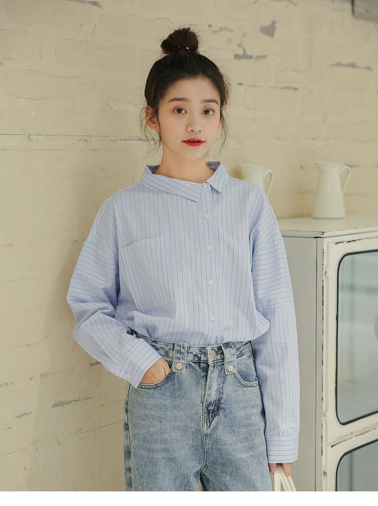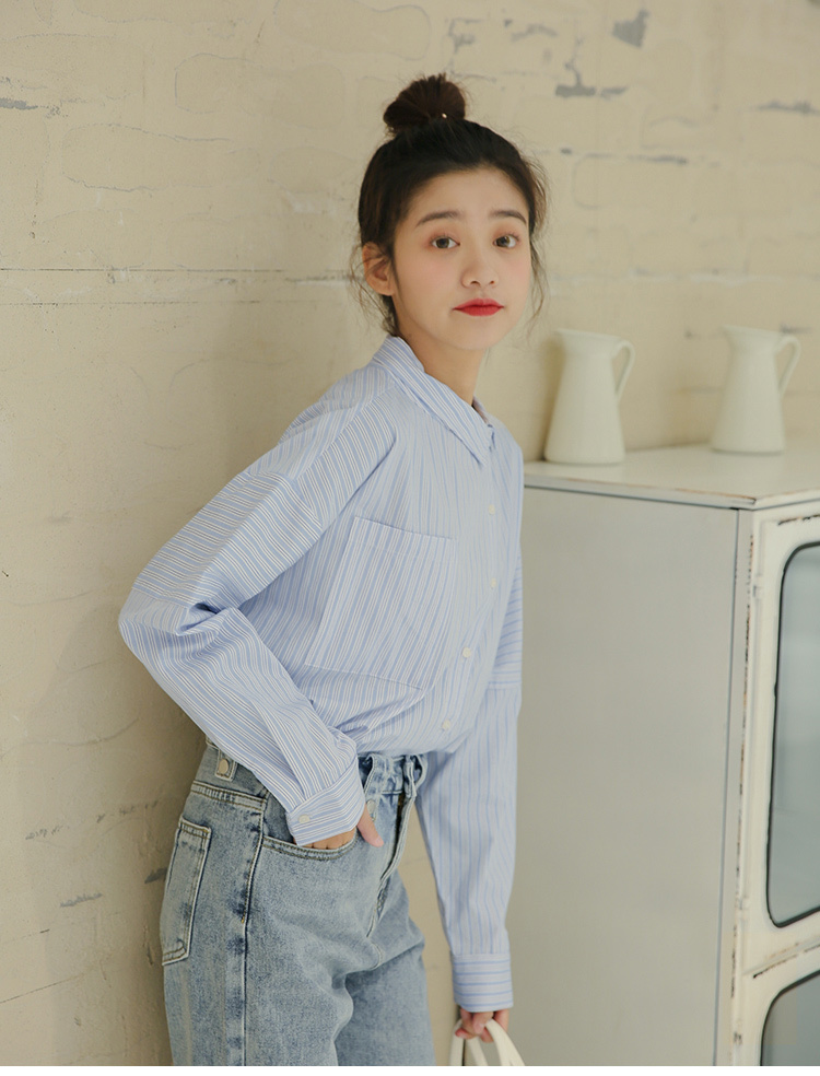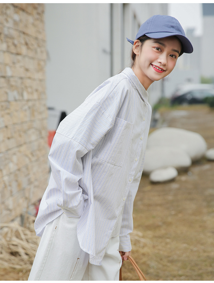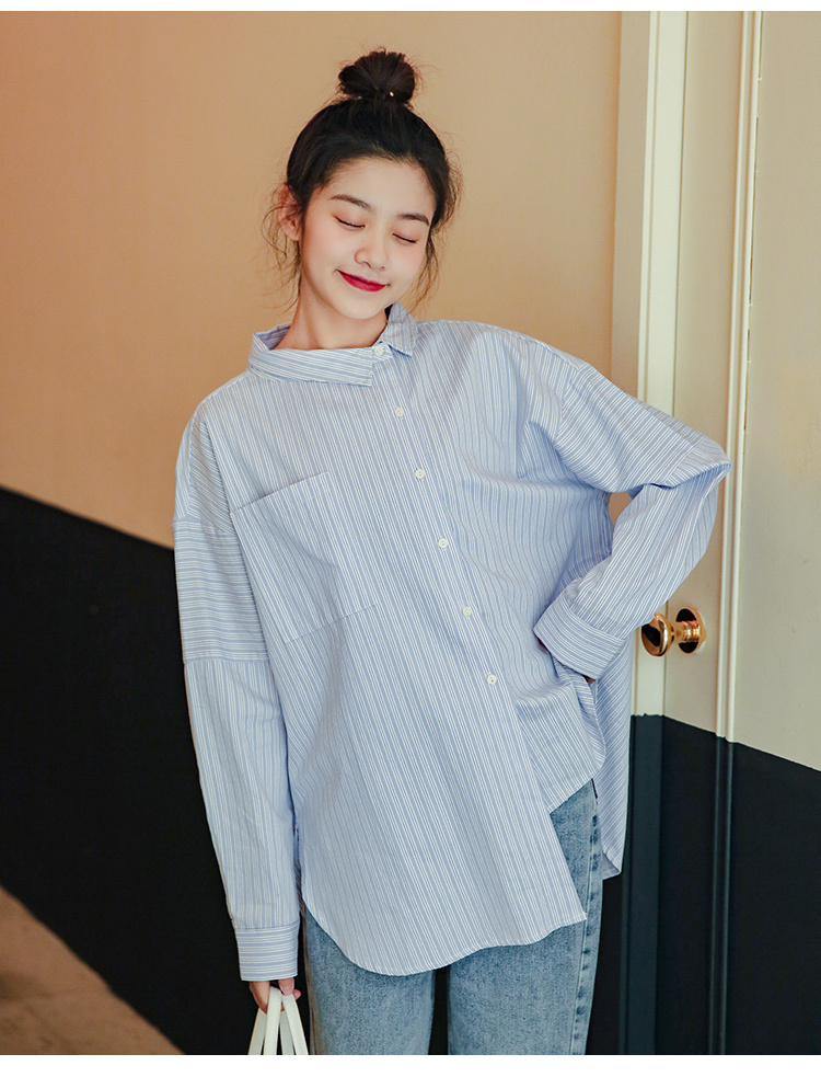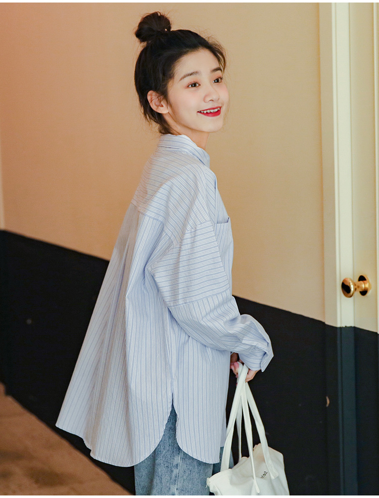 春らしく爽やかな雰囲気の長袖ストライプ柄シャツです。