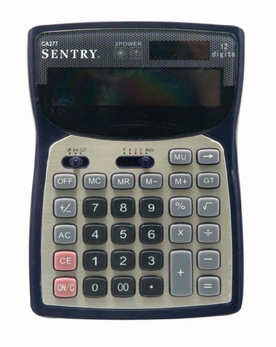 This calculator has a 12-digit LCD tilted display. It’s solar powered with a backup battery included for low light conditions. It has colored keys, rubber grips, 5/4 rounding, memory, and auto off.