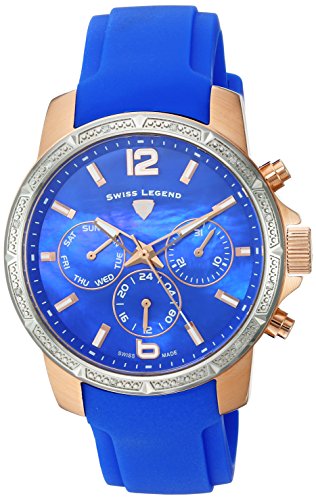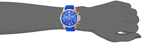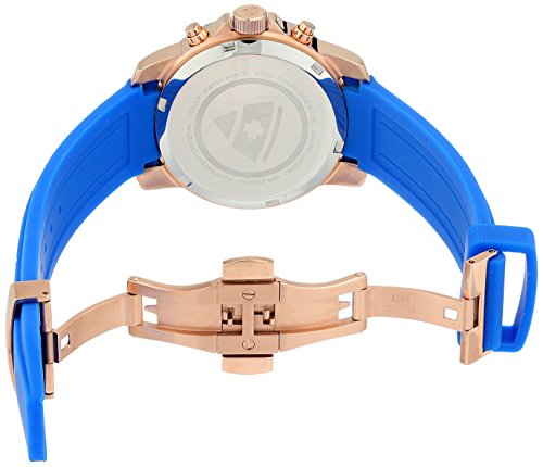 Blue Mother of Pearl Dial with Rose Gold Tone & White Hands, Hour Markers and Arabic Numerals; Luminous; Rose Gold Tone IP Stainless Steel Case; Blue Silicone Strap