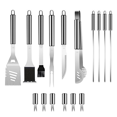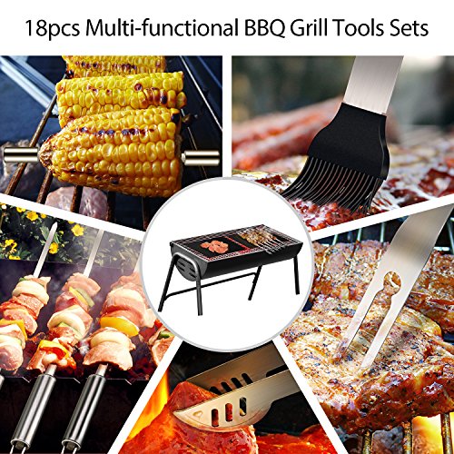 - 18PCS COMPLETE KIT: Boblove 18-piece BBQ tools set includes 2 mats,1 tong, 1 fork, 1 grill brush, 1 basting brush, 4 skewers, 6 corn holders, 1 replaceable head of grill brush, and 1 spatula that has 4 functions