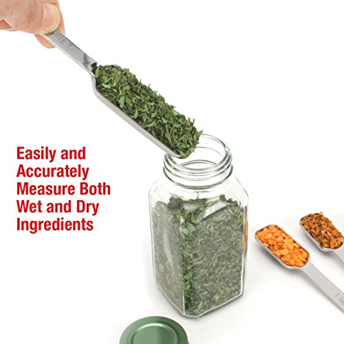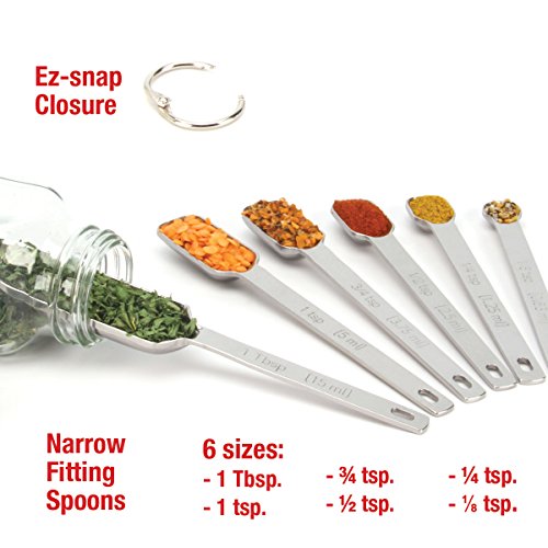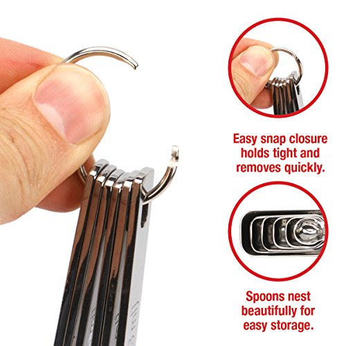 - SAVE TIME IN THE KITCHEN Not only is measuring liquid and dry ingredients (such as salt, pepper, spices, cumin, rosemary, etc.) a breeze, they are quick and easy to clean and dishwasher safe. Also, the EZ-Snap ring lets you quickly separate the spoons for sharing and the bonus leveler makes accuracy a breeze. Easy storage, can hang on the ring and they nicely nest together.