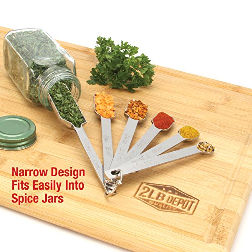 2LB Depot Premium 18/8 Stainless Steel Measuring Spoons - Set of 6 with Bonus Leveler Narrow Accurate Measuring Spoon Design Fits in Spice Jars