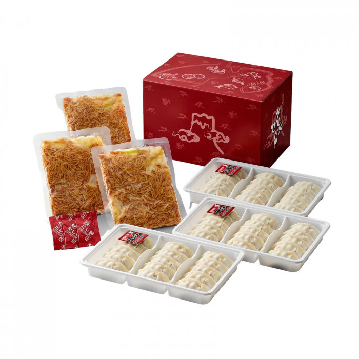 | 原材料 | 名称:むし焼きそば(調理済み)、餃子 ●富士宮やきそば 【調理済み焼きそば】めん(小麦粉、食塩、小麦たん白/加工澱粉、かんすい、クチナシ色素、(一部に小麦を含む))、ウスターソース、キャベツ(国産)、植物油脂、味付け豚肉(豚肉、食塩、植物油脂、澱粉、しょうが、しょうゆ)、肉天かす(いか天かす、味付け豚肉)/調味料(アミノ酸等)、カラメル色素、酸味料、ソルビトール、増粘多糖類、香料、トレハロース、(一部に小麦・いか・大豆・豚肉・ゼラチンを含む) 【だし粉】魚介パウダー(いわし、さば)、あおさ、(一部にさばを含む) ●浜松餃子 【餃子】野菜(キャベツ(日本)、玉ねぎ(日本)、にら(日本)、にんにく、生姜)、小麦粉、豚肉、豚脂、粒状植物性蛋白、砂糖、食塩、発酵調味料、調整ラード、ごま油、澱粉、植物油脂、香辛料、ほたてエキス、調味料(アミノ酸等)、(原材料の一部に小麦・大豆を含む) 【餃子たれ】醤油、醸造酢、ぶどう糖果糖液糖、食塩、砂糖、米油、ごま油、香辛料、調味料(アミノ酸等)、パプリカ色素、(原材料の一部に小麦・大豆・りんごを含む) |