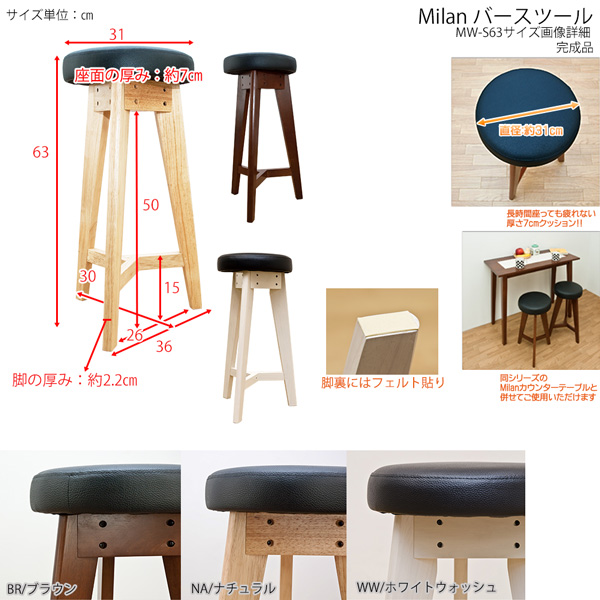 本商品はお取り寄せ商品のため、稀にご注文入れ違い等により欠品・遅延となる場合がございます。誠に恐れ入りますが、何卒ご了承ください。 また、以下の場合には追加送料がかかる場合がございます。  ・大型商品の複数購入時 ・同梱区分が異なる商品の複数購入時  【出荷目安】:1 - 4営業日 ※土日・祝除く 【同梱区分】:TS 1490 【梱包サイズ】:大型商品 【代引き決済】:不可  配送伝票の依頼主は出荷元(メーカーもしくは仕入元)名となる場合がございますので、お受け取りの際はご注意ください。   【型番】MWS63  【商品名の色やサイズについて】 こちらは「丸型バースツール/丸型椅子 (Milan) 【1脚】 高さ63cm 木製/合成皮革 北欧風 ナチュラル」の商品ページです。商品画像や商品情報には、色違いやサイズ違いの商品が載っている場合がございます。ご注文前に色・サイズ・セット内容のご確認をお願いいたします。  ホワイトウォッシュ色が追加になりました。※真っ白ではありません。木目がうっすら見えます。  天然木の可愛い丸型バースツール。 木目を生かしたデザインと、細身の脚がモダンな雰囲気を出しています。 スリムなデザインなので場所もとりません。 座面は手入れのしやすさと掃除が楽なPVC(合成皮革)。 黒と天然木の組み合わせがシックなスツールです。  ※こちらは1脚での販売になります。2脚セットではないのでご注意下さい。  幅360×奥行360×高さ630mm 座面サイズ:31φ クッション厚:70mm 重量:2.8kg 完成品 座面:合成皮革(内材:ウレタンフォーム) 脚部フレーム:天然木(ラッカー塗装)  【ご注意事項】 ※本商品は、北海道・沖縄・離島への配送はいたしかねます。あらかじめご了承ください。