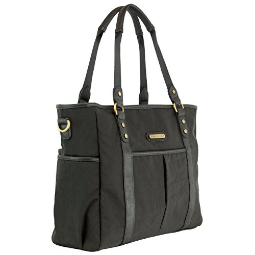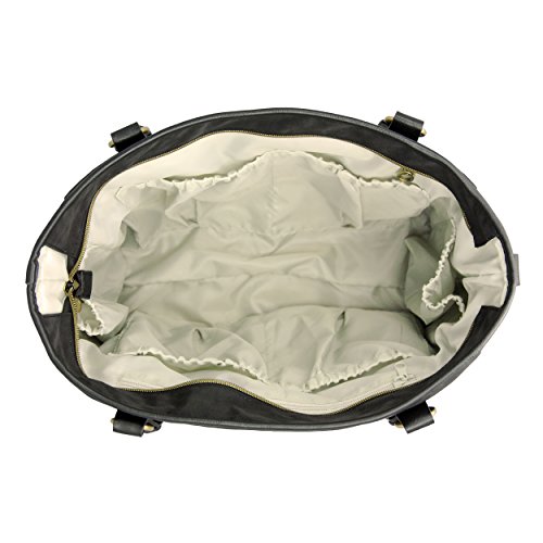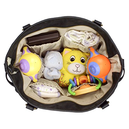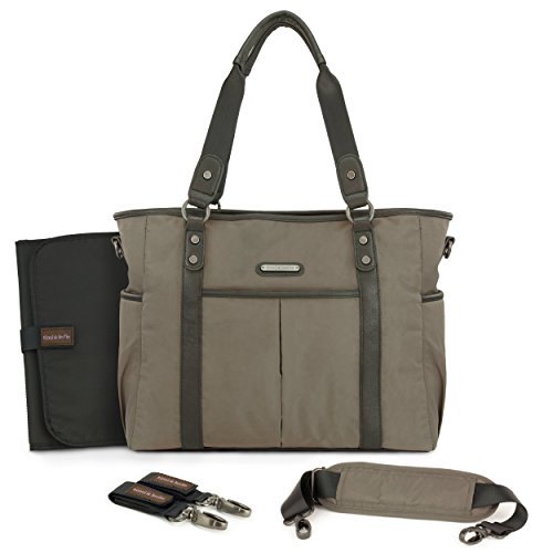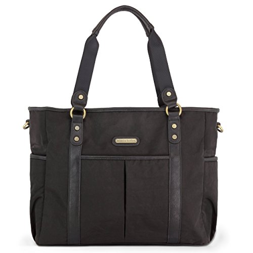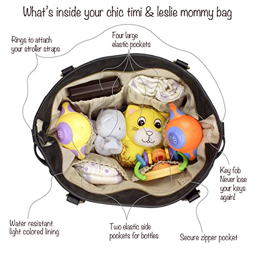 Channel timeless sophistication with the Classic Tote bag from timi & leslie. It is made from smooth, durable nylon with vegan faux leather accents (PVC free) and custom hardware in an antique brass finish. The Classic Tote bag has a roomy interior with multiple compartments to fit all of your and baby's essentials. Always be in style and never sacrifice function with the Classic Tote bag. Each Bag features: An adjustable cross body, detachable strap so you can wear the bag hands free; A neoprene-lined, cushioned shoulder strap for stress free carrying; Coordinated non-slip stroller straps to conveniently hang your bag from your stroller; Our specially designed changing pad with a front pocket to store your diapers, wipes or cream when you need to make a quick diaper change trip; 4 outside pockets, including 2 insulated side pockets to keep baby's bottles warm or cool; 7 inside organizational pockets; Inside key fob - never lose your keys again.Feature