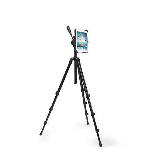 Dual level metal Pan head has smooth panning. Tripod working height up to 5 feet! Mount fits 9-14.5 inch tablets.