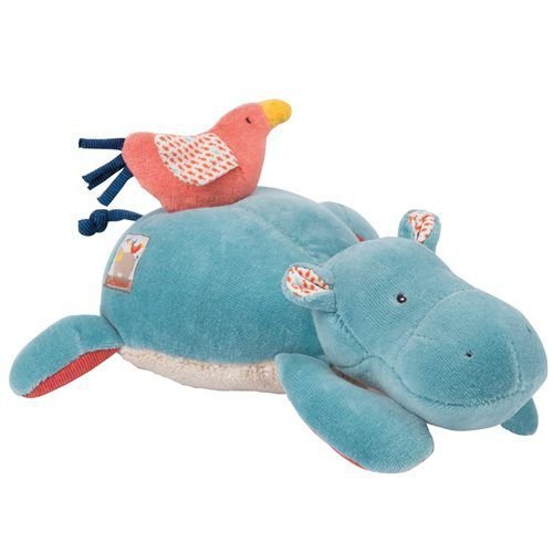 Musical hippopotamus doll in steel blue terry velvet and taupe looped velvet tummy, set off by coral tones of striped jersey in the feet and by a fish print cotton in the ears. Lying on its stomach, it's an invitation to sleep. Music activated by pulling on its pal, the little bird on its back.