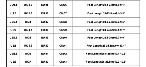 Studio : Sikye Publisher : Sikye Product Description Package: 1 Pair Women Shoes(not including shoebox) NOTE: As different computers display colors differently,the color of the actual item may vary slightly from the above images. US:5.5 UK:3.0 EU:35 CN:36 Foot Length:22.5-23cm/8.9-9.1" US:6 UK:3.5 EU:36 CN:37 Foot Length:23-23.5cm/9.1-9.3" US:6.5 UK:4 EU:37 CN:38 Foot Length:23.5-24cm/9.3-9.5" US:7 UK:4.5 EU:38 CN:39 Foot Length:24-24.5cm/9.5-9.7" US:7.5 UK:5 EU:39 CN:40 Foot Length:24.5-25cm/9.7-9.9" US:8 UK:5.5 EU:40 CN:41 Foot Length:25-25.5cm/9.9-10.1" US:8.5 UK:6 EU:41 CN:42 Foot Length:25.5-26cm/10.1-10.3" US:9 UK:7 EU:42 CN:43 Foot Length:26-26.5cm/10.3-10.5" 0