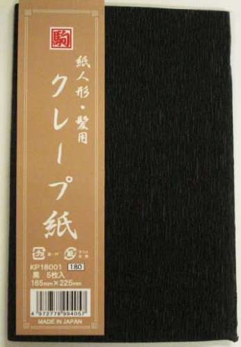 -. Binding : Office Product -. Brand : Unknown -. Color : black -. EAN : 4972778994057 -. Feature : Textured black double sided crepe like paper / 165 mm by 255 mm sheets (about 6 1/2 by 9 3/4 inches) / 5 sheets per package / This double sided black paper is normally used for making the "hair" in the origami paper dolls / Made in Japan -. Label : NA -. Manufacturer : NA -. MPN : N8361 -. PackageQuantity : 5 -. PartNumber : N8361 -. ProductGroup : Office Product -. ProductTypeName : PAPER_PRODUCT -. Publisher : NA -. Studio : NA -. Title : Japanese Black Crepe Craft Paper, Japanese doll hair paper, 5 sheets #N8361
