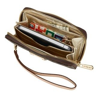 - Feature : Accent gold metal hardware with Michael Kors logo / Made with premium saffiano leather / Separate compartments for all your essentials / Compartment specially designed to fit and protect your iPhone 3GS/4/4S/5/5S / Imported