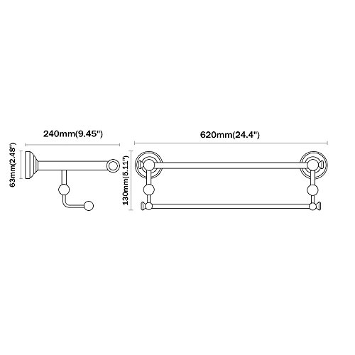 -. Feature : Perfect for home and hotel,good appearance / Brass made, high quality, anti-rust, not easy to fade / With double towel bars and space for other bath essentials, this towel rack saves a lot of space / A standard mount and concealed screws are included for easy installation / Length: 620mm Height: 130mm Width: 240mm