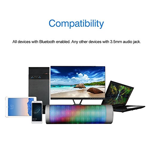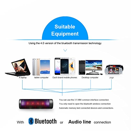Feature : 360-degree LED pulsating music, 6 kinds of music pulsating LED Lights Speakers. / Equipped with 3600-4600mAh Rechargeable Battery for up to 10 hours of playtime. Built-in microphone for hands-free phone call. / Bluetooth audio:10 meters range with smartphones, tablets or other bluetooth device shine connection play audio / Audio input:Stereo audio input interface, easy to connect computer, digital music player, mobile phone and other audio equipment / Touch the keys:A new interactive experience operation, finger kiss a touch product keys function can be realized