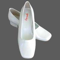 こちらのウェディングシューズのヒールは3cmのローヒールタイプです。どのようなウエディングドレスに合わせやすいです。