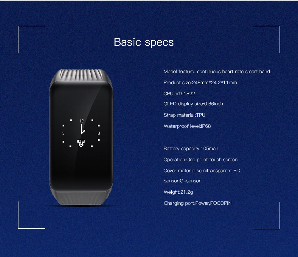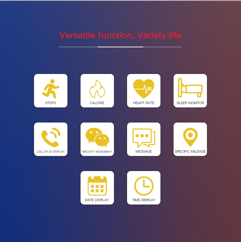 Function:Alarm Clock,Push Message,Speed Measurement,Passometer,Social Media Notifications,Message Reminder,Sleep Tracker,Activity Tracker,Heart Rate Tracker,Call Reminder,Fitness Tracker