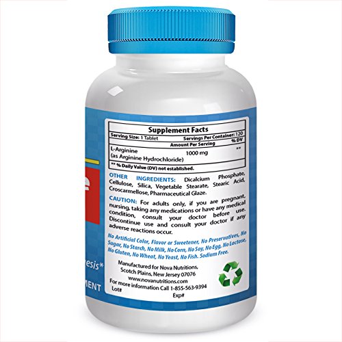 -. Binding : Health and Beauty -. Brand : Nova Nutritions -. EAN : 0732363270010 -. Feature : Supports Nitric Oxide and Protein Synthesis* / Supports healthy circulation* / Promotes Stamina and Performance* / Promotes a Healthy Cardiovascular System* / Top Quality - Laboratory Tested -. IsAdultProduct : 0 -. Label : Nova Nutritions -. LegalDisclaimer : *These statements have not been evaluated by the Food and Drug Administration. This product is not intended to diagnose, treat, cure or prevent any disease. -. Manufacturer : Nova Nutritions -. PackageQuantity : 1 -. ProductGroup : Health and Beauty -. ProductTypeName : HEALTH_PERSONAL_CARE -. Publisher : Nova Nutritions -. Studio : Nova Nutritions -. Title : L-Arginine 1000 mg 120 Tablets by Nova Nutritions -. UPC : 732363270010