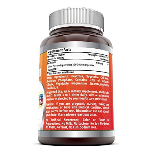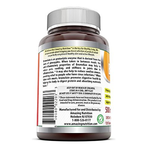 -. Binding : Health and Beauty -. Brand : Amazing Nutrition -. EAN : 0810180022033 -. Feature : SUPPORT FOR DIGESTION & MORE Bromelain Is Shown To Promote Healthy Digestion, Fight Inflammation And Improve The Absorption Of Vital Nutrients. Amazing Nutrition Helps You Reap Its Benefits! / OPTIMAL DOSE Each Of Out Bromelain Tablet Provide 500mg Bromelian Dosage With 300 Digestive Enzymes, Providing You A Generous Dose Of Enzymes For Healthy Digestion! / ALL NATURAL BROMELAIN Our Bromelian Digestive Enzymes Supplement Is Extracted From Pineapple, Not Manufactured In A Laboratory. It's Completely Free Of Preservatives & Artificial Sweeteners, Colors And Flavors. / DIET FRIENDLY DIGESTIVE ENZYMES Gluten Free & Free Of Milk, Lactose, Soy, Wheat, Yeast, Fish & Sodium; It's One Of The Best Proteolytic Enzymes Supplement For Any Healthy Diet / PREMIUM QUALITY All Amazing Nutrition Products Are Manufactured In A GMP-Certified Facility In The USA To Ensure Safety And Purity -. Label : Amazing Nutrition -. Manufacturer : Amazing Nutrition -. PackageQuantity : 1 -. ProductGroup : Health and Beauty -. ProductTypeName : HEALTH_PERSONAL_CARE -. Publisher : Amazing Nutrition -. Studio : Amazing Nutrition -. Title : Amazing Nutrition Bromelain Supplement - Best Proteolytic Digestive Enzymes Supplements - 500mg Tablets for Healthy Digestion, Anti- Inflammatory Support & More - 120 Enzyme Tablets Per Bottle -. UPC : 810180022033