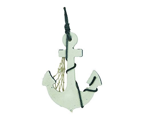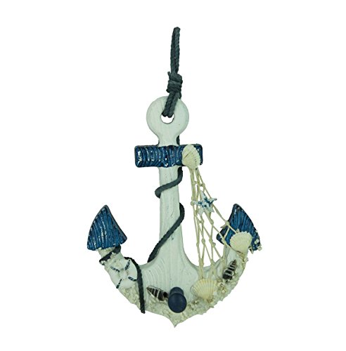 - The anchor-shaped wooden sign is painted in shades of blue and white, and has attached rope and shell details.