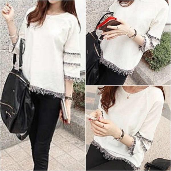 着痩せ効果☆エスニック ボヘミアン ゆったり フリンジ カジュアルトップス 白