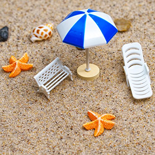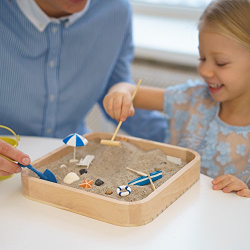 A great way to learn This miniature beach brings the outdoors indoors, and is a great way for kids to learn. Whether you make a family project of bringing the seasons into the scene through leaves, twigs and shells, or simple let your kids loose with their dinosaurs and action figures, they'll have the opportunity to develop gross and fine motor skills, creativity, organization and planning. The box is 10.5x10.5in (26.5x26.5cm) and 2in (5cm) high. Natural, beige sand is included, and fills the box over half way. The set features 10 accessories, plus stones and shells. The accessories include a bucket, spade and rake; a miniature boat with oars; a sun lounger and umbrella; 2 starfish; and a red safety ring. 0