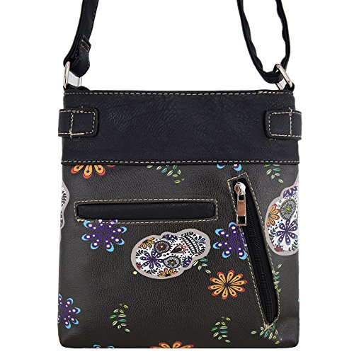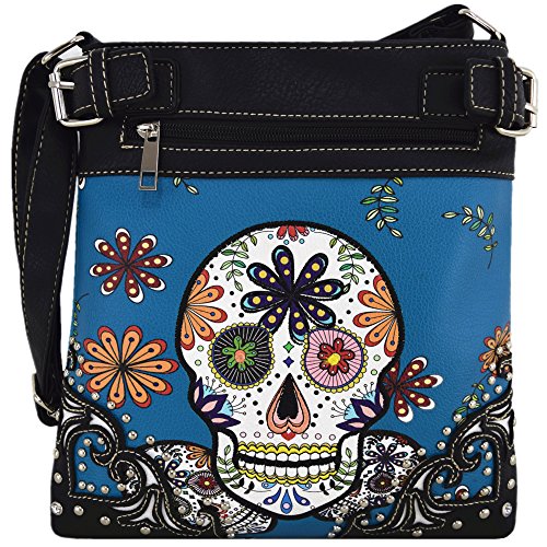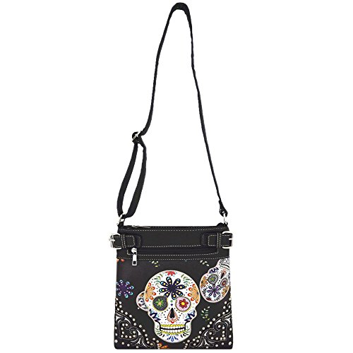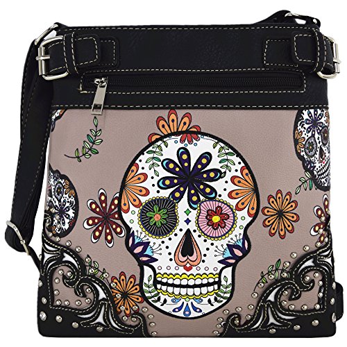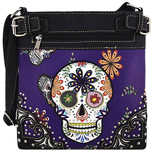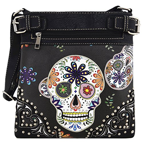 Handbag Measurements: Height: 10.25" Width: 10" Depth: 2" Beautiful Artisan Laser Cut Floral Design with Printed Sugar Skull,Embroidery Flower And Features Spacious Interior and Back Concealed Carry Pocket and Phone Slot Pocket and Adjustable Cross Body Strap