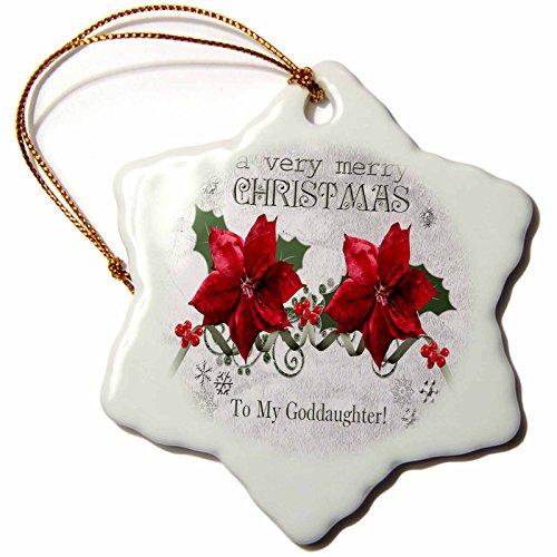 3dRose orn_154932_1 Berries and Poinsettias a Very Merry Christmas to My Goddaughter Snowflake Ornament, Porcelain, 3-Inch