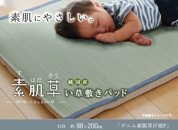 【商品名】純国産 やわらかい草の敷きパッド 『デニム 素肌草 汗取P』 88×200cm