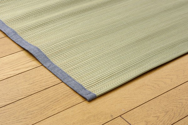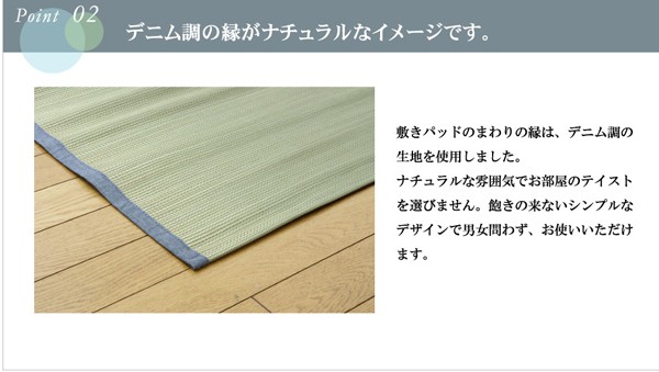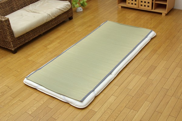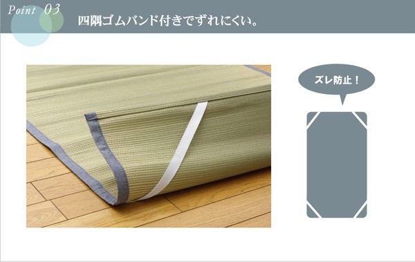 長時間、肌に接する寝具だからこそ、自然素材を使い、やわらかな質感にこだわりました。快眠い草の効能として1.綿の3倍の吸湿力 2.蒸れにくい。汗による湿気を吸うことにより温度を下げ快適な就寝を促します。 3.汗のにおいを軽減。汗のにおいの元となる化学物質を90%以上抑えます。などがあります。染料、染土を使わない国産(九州産)のしなやかなイ草を使用していますので、柔らかく、すべすべとしており身体にフィットします。裏面には四隅にゴムバンドが付いています。