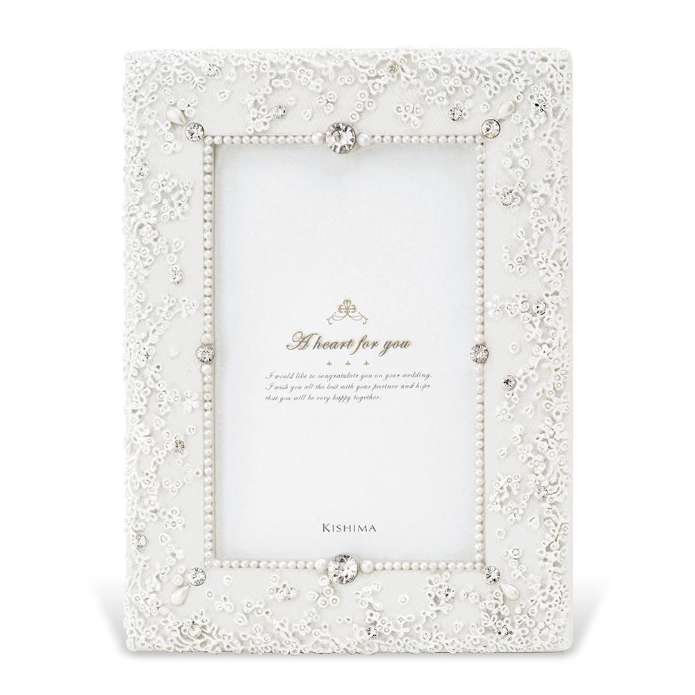 | 繊細に施されたチュールレース模様が女性らしい、フェミニンなフォトフレーム。散りばめられた大小様々なラインストーンと、パールをあしらったような質感が、写真を華やかに演出してくれます。 |