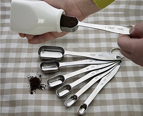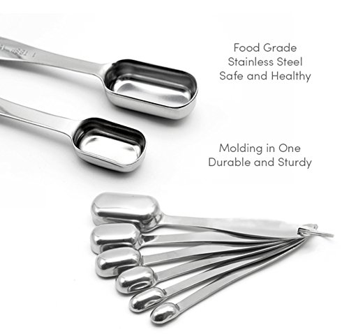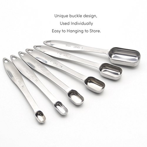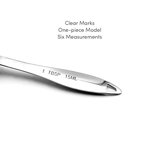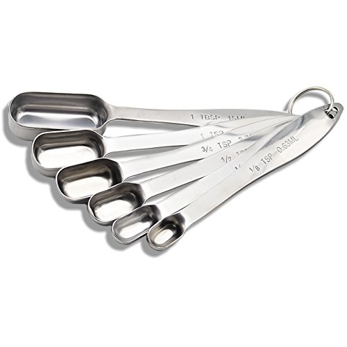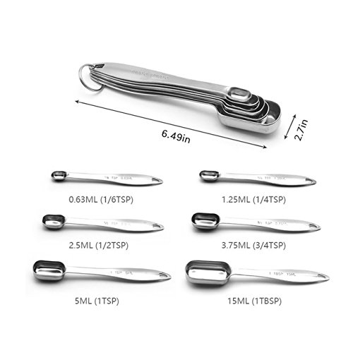 TOP BENEFITS: The metal is thick enough that these spoons are meant to last a lifetime. The sizes are very clearly marked on the handles of each spoon in both the teaspoon and m/l formats. Six measurements, even including 1/8 TSP (0.63 ml) and 3/4 £¨3.75 ml, so that you not have to guesstimate what half of 1/4 TSP. Long, narrow bowls of the spoons that you can reach into a jar of herbs, rather than spilling the herbs as shaking them onto a measuring spoon. StarVast spoons kit comes on a chain, which can easily be separated so that you only need to remove the ones you plan to use for a particular recipe, or you can keep them apart and hang them up on a rack you may have.