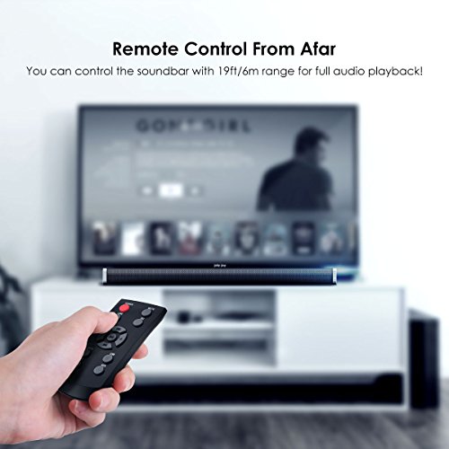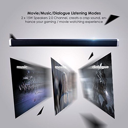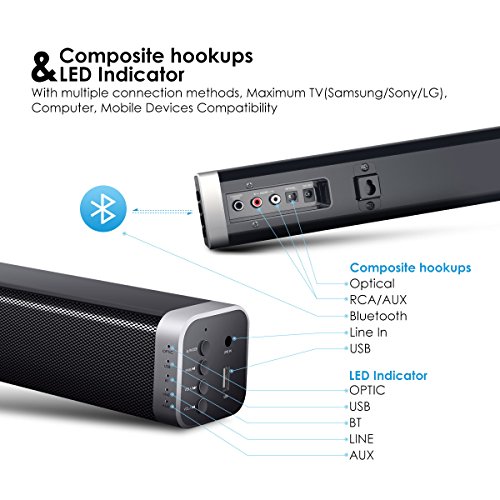 -. Feature : SLEEK, SLIM TV SOUNDBAR designed to fulfill your desire for Bigger, Better Sound, sound for the most authentic home theater setup / FLEXIBLE CONNECTIVITY OPTIONS Include: LINE(3.5mm jack line-in cable included), AUX, USB, Bluetooth & Optical for Maximum TV/Computer/Mobile Model Compatibility / 3 AUDIO OPTIONS Include Music, Movie, & Dialogue and are Easily Selectable by the Included Remote Controller / IMPRESSIVE POWER & TECHNOLOGY Create Theater-Quality Sound, Making This the Perfect TV/Computer/Video/Music Sound Bar / 100% Satisfaction Guarantee- Your satisfaction is our guarantee! If you don't absolutely love your sound bars for any reasons, let us know and we'll refund your money back or send you a replacement! ORDER NOW WITH NO RISK!