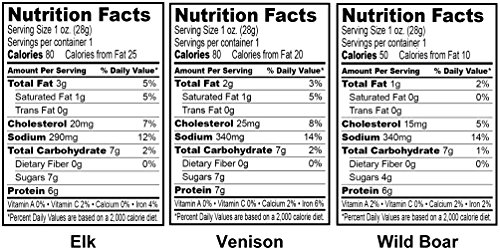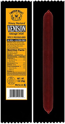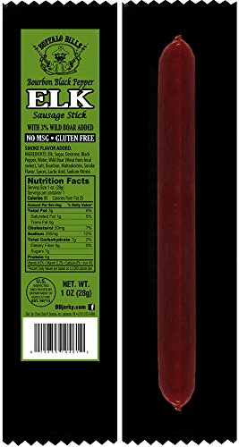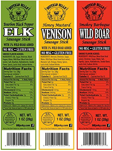 Studio : Choo Choo R Snacks, Inc. Publisher : Choo Choo R Snacks, Inc. Binding : Misc. Product Description Each tub of Buffalo Bills 100% Exotic Game Meat Sausage Sticks contains 15 assorted individually wrapped 1oz sticks - five each of Bourbon Black Pepper Elk, Honey Mustard Venison, and Smokey Barbecue Wild Boar. Each 1oz stick averages 6" in length. Our selection of Buffalo Bills Exotic Game Sticks is simply second to none. Unlike our competitors who use a large percentage of beef and/or chicken in their "game sticks" to cheapen their product cost, Buffalo Bills Exotic Game Sticks are made solely with 100% game meat. Not only are they made with pure game meat, each one has their own bold and distinctive flavor profile - Bourbon Black Pepper Elk, Honey Mustard Venison, and Smokey Barbecue Wild Boar. Game meat enthusiasts will love them! Buffalo Bills Exotic Game Sticks contain no MSG, no trans fats, and they are gluten free. 0