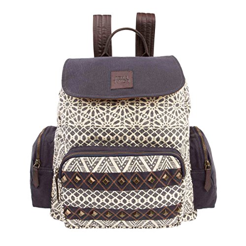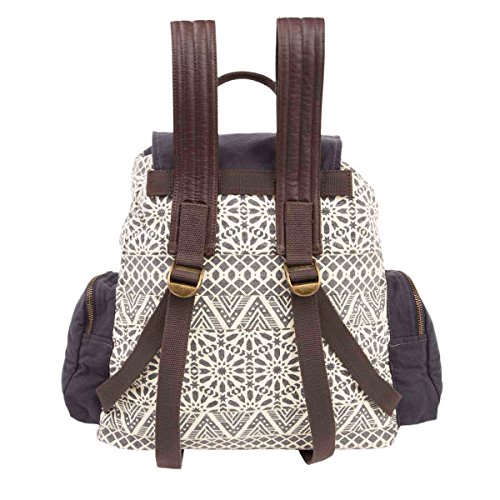 Product Description The Brooke Rucksack is a perfect combo of functionality and fashion-forward style. Pack gym clothes, books, a laptop (can hold a 13' MacBook) or snacks in a comfortable bag for an active agenda. Go for a modern, yet classic look with Brooke's enzyme washed canvas print with its eye-catching geometric pattern. Featuring shades of winter pear, indigo, and caramel. Featuring genuine coffee brown cushioned leather with adjustable cotton straps and antique brass studs. Rucksack: 14" opening, H 15" Base: W 12" x D 6". 2 straps 41", 1 carry handle. Cushioned vegan leather shoulder straps with thick cotton adjustable straps at the bottom. Brass hardware with snap and drawstring closure. 0