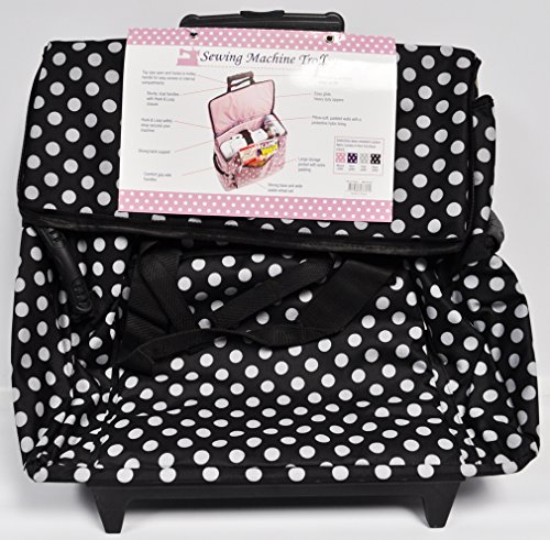 -. Feature : Sewing Machine Trolley Black and White Polka Dot / Features: Top zips open and hooks to trolley handle for easy access to internal compartments. Sturdy dual handles with Hook & Loop closure. Hook & Loop safety strap secures your machine. Strong back support. Comfort grip handles. Telescoping lockable metal handle. Easy glide heavy duty zippers. Pillow soft padded walls with a protective nylon lining. Large storage pocket with extra padding. Strong base and wide stable wheel set. / Interior Dimensions: 19 X 8 X 14.