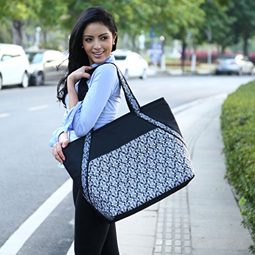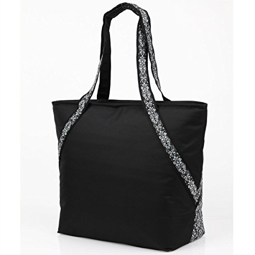-. Brand : Sachi -. Color : Black -. Feature : HUGE size can fit a cooler's worth of food/50 cans / Insulated interior keeps food cold or warm all day, top zipper closure, leak-proof / Large exterior accessory pocket - can fit tablet, Black Damask pattern / FDA-food safe interior, BPA-free, easy to clean / 16"H x 22"L x 8"W, 10.75" strap drop -. ProductGroup : Major Appliances -. ProductTypeName : REFRIGERATION_APPLIANCE -. Title : Super Sachi Hot/Cold 50-Can Insulated Cooler Tote Bag Leak-Proof Picnic