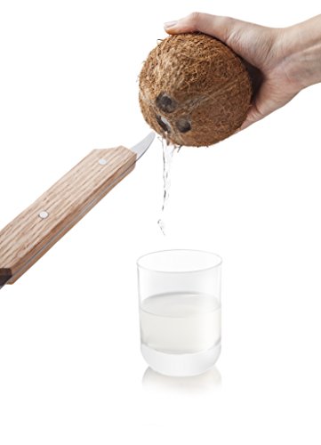To use, puncture the soft ‘eye’ of the coconut wiht the end of the coconut opener and pour out the coconut water into a glass. Then, smack the center of the coconut perpendicular to the grain. Rotate the coconut and smack again until the interior coconut meat cracks.