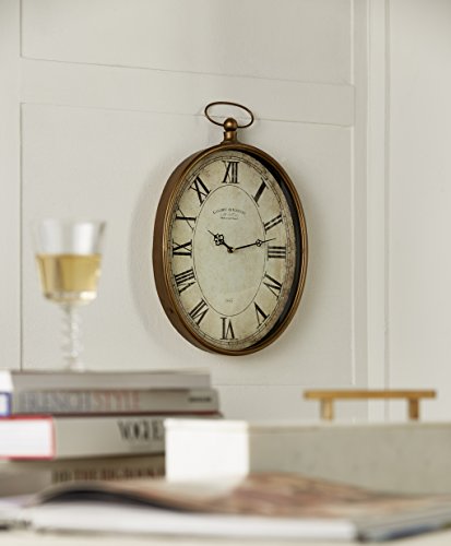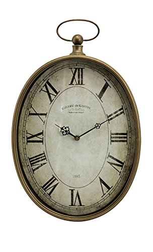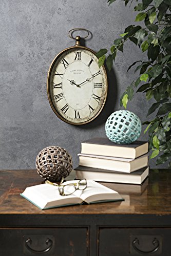 Oversized wall clock inspired by the styling of an antique men’s pocket watch. Clock face has an antique finish and the frame is finished with an aged patina. Measures 20.5-Inch High by 12.75-Inch Wide by 2.25-Inch Deep. Due to the artisan crafted nature of this product, no two will be identical. Brought to you by IMAX Worldwide-One Source.Feature