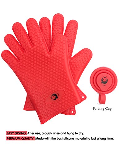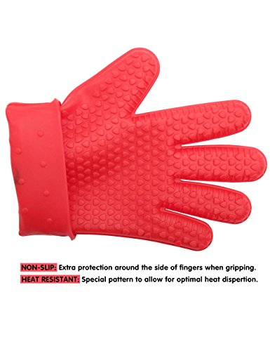 FOX-T 100% Silicone Oven Mitts Pot Holder For Cooking BBQ 5 Finger Protective Kitchen Heat Resistant Gloves- 1 Pair (Red)