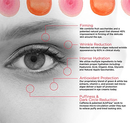 -. Feature : REDUCE FINE WRINKLES. Clinically tested Alguard® Red Micro-Algae has been shown to immediately provide lifting and tightening effects around the eye area. This sustainably farmed algae is a favorite in Europe and Asia. / BRIGHTEN UP YOUR EYES. Our unique formula helps to illuminate and brighten dull complexion around the eyes. / MOISTURIZE & PROTECT. Hyaluronic acid, apple saccharides, cucumber extract, organic aloe and jojoba esters work together to hydrate and protect the delicate skin around your eyes. / REDUCE PUFFINESS, INCREASE CIRCULATION. Dark circles and puffiness are often a sign of poor circulation. Our unique blend of caffeine and clinically tested ActiFlow help to improve skin microcirculation. / ALINA PROPRIETARY ANTI-OXIDANT BLEND. Fueling your skin with important antioxidants that help protect from free radicals and oxidation is critical to maintaining healthy skin. Our unique antioxidant blend of Green & White Tea along with Vitamin C and E provide essential antioxidant support.
