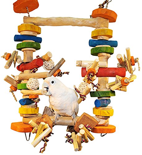 - This “Chew & Swing” bird toy is made from colorful, earth-friendly materials that birds enjoy munching on, such as dense, long-lasting slices of java wood; strings of sisal, as well as chewable pieces of bamboo and coconut.