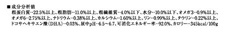 素材構成:粗蛋白質…22.5%以上、粗脂肪…11%以上、粗繊維質…4%以下、水分…10%以下、カルシウム…1.6%以上、リン…0.99%以上、ナトリウム…0.38%以上、タウリン…0.22%以上、オメガ3…0.9%以上、オメガ6…2.75%以上、尿中pH…6.5~6.7、DHA…0.03%