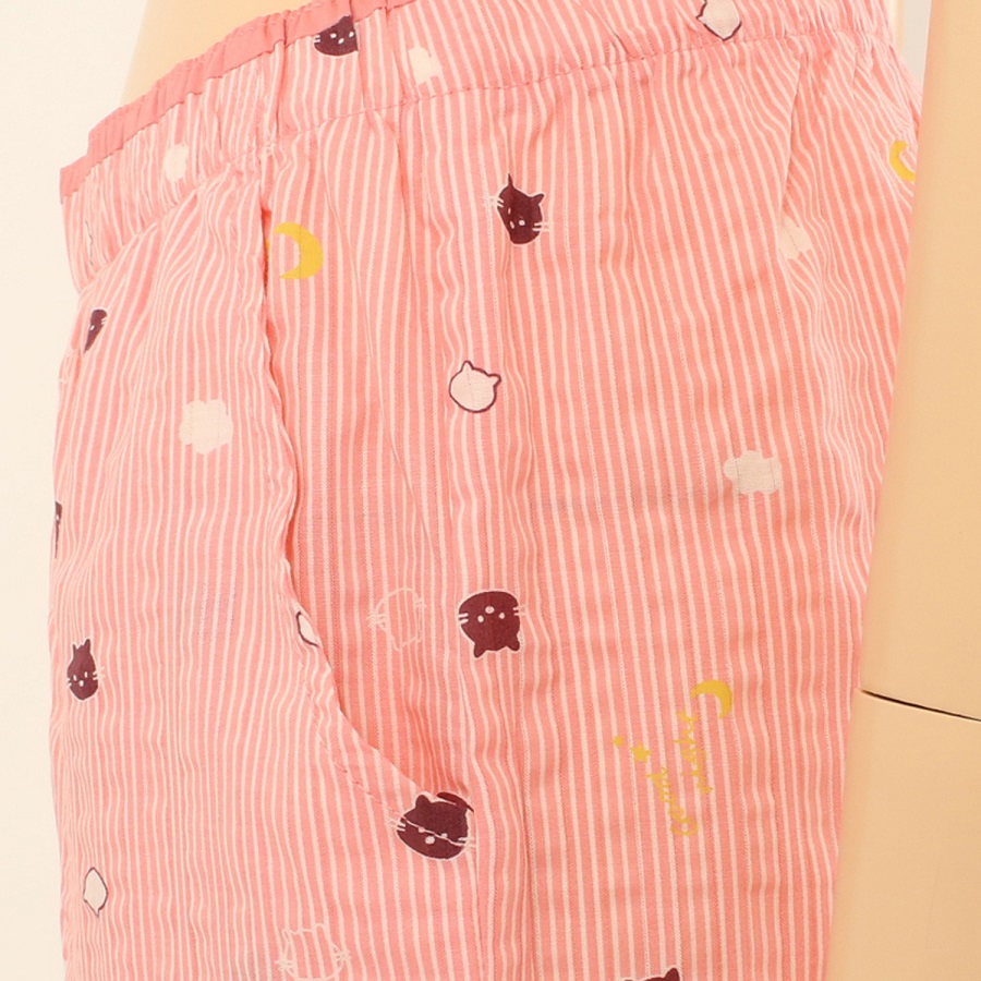 귀여운 고양이 캐릭터와 스트라이프 패턴이 어우러져 심플하고 깔끔한 느낌의 파자마 바지입니다.