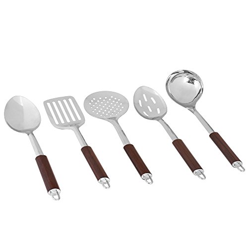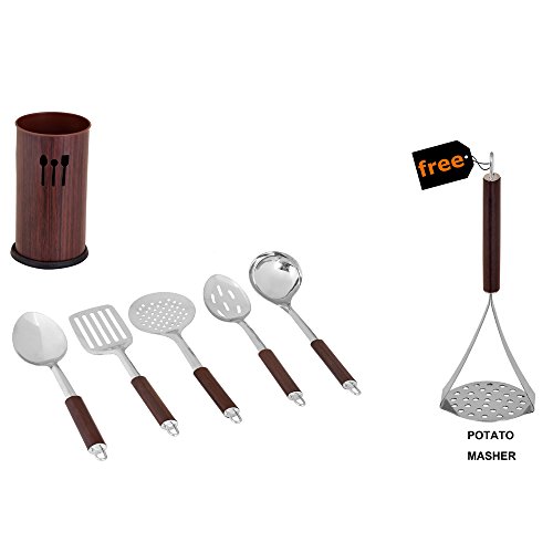 -. Feature : This fine Kitchen tool set includes Serving Laddle, Skimmer, Slotted Turner, Blasing Spoon, Slotted Spoon , Tool Holder &" Free" Potato Masher / The comfort grip with Coloured stainless steel handle is heat resistant and easily cleaned in the sink or in the dishwasher. / Ideal for use in family kitchen , Restaurants, Food outlets, Catering Industry, Hotels and bbq and away on picnics / Can be conveniently Nested on Pot Rim, or Hung on Rack.