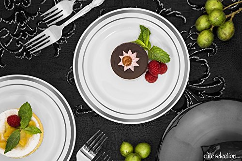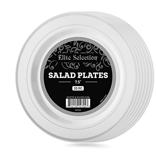Elite Selection Pack of 25 White Salad / Dessert Disposable Party Plastic Plates With Silver Rim 7.5-Inch