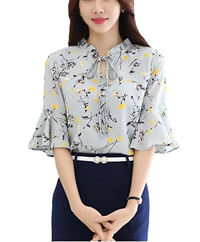 -. Title : 【アズスカイ】Asskyレディース ブラウス チュニック ワーク 通勤シャツ プリント 花柄 シフォン ラウンドネック 蝶リボン 半袖 スピーカースリーブ ロータススリーブ  (XL, グレー)