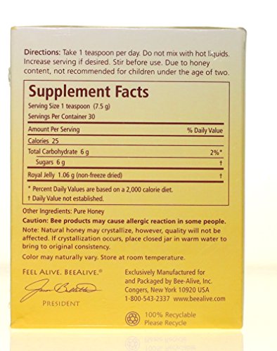 Feel like you are moving in slow motion? Too tired to keep up with your days? One of our most potent formulas, Sweet Energy FormulaTM is a blend of fresh, never freeze-dried, Royal Jelly and natural honey for a delicious taste. Provides a generous 1,066 mgs of Royal Jelly in every teaspoon. Sweet Energy FormulaTM is perfect for anyone who enjoys the taste of honey and wants to take a larger amount of Royal Jelly to energize their life everyday, and who may have difficulty swallowing capsules or tablets. Delicious straight from the jar! Or spread on toast or add to your favorite yogurt. You will feel the difference in your life!Feature