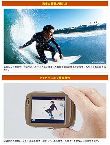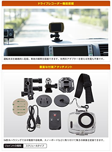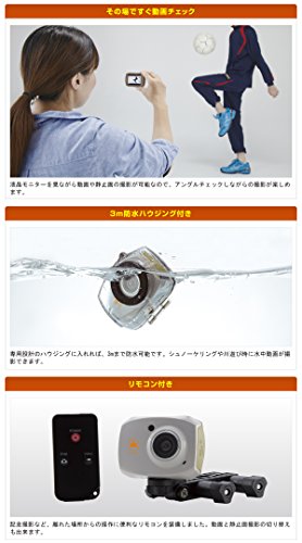 大型タッチパネル内蔵で誰でも簡単に操作でき、その場で映像を確認できるプレビュー機能付です。リモコン付で離れた場所で撮影のON/OFFが行えるのでビデオチャンスを逃しません。手振れ補正機能で、振動にも強く誰でも失敗なく動画と静止画が撮影できます。 動画:FHD1920×1080(30fps)/HD1280×720(60fps)/HD1280×720(30fps)/VGA:640×480(120fps) 静止画:1200万画素(4000×3000)/1000万画素(3648×2736)/800万画素(3264×2448)/500万画素(2592×1944) 充電時間:(約)4時間 目安作動時間:(約)1-1.5時間 ホワイトバランス:オート 手ブレ補正:デジタル手ブレ補正 記録媒体:microSDHC32GBまで対応Class4-10対応(10推奨) 動作確認済OS:Windows2000,XP,VISTA,Windows7,MACOSx10.6 ●構成 カメラ本体、防水・防塵ハウジング(3m)、ヘルメットマウント、ヘルメットベルト、バイクマウント、リモコン、サーフ(スノー)ボードマウントセット(3Mスティッカー含む)、USBケーブル、3Mスティッカー(予備)2枚