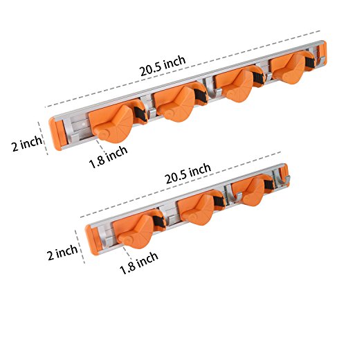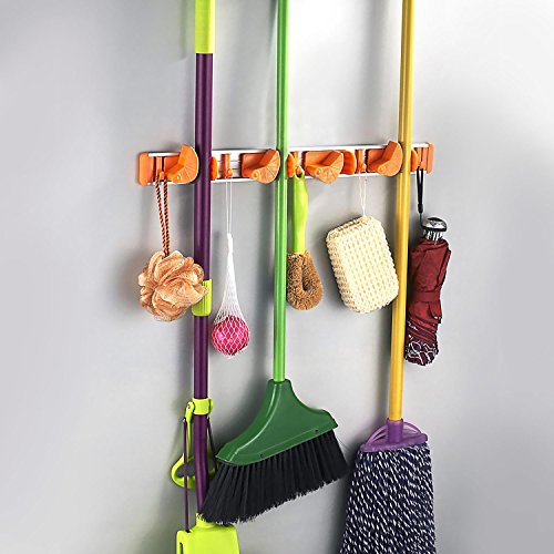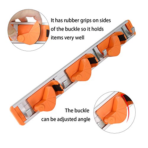 - ADJUSTABLE-This is a Wall Mounted Broom Holder,the buckle can be adjusted angle, so it can hold the mop rod with a variety of diameters (1.5~3.5 cm ).There are 4 friction-grips and 5 hooks that can be Sliding around if needed- so you can keep your mops, brooms, etc out of visual site.