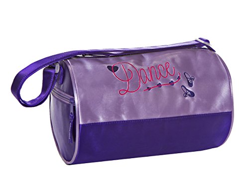 -. Feature : A bright, cheery satin-finish small duffel. Embroidered "Dance", purple pointe shoes, hearts one side. / Zipper closure. Fully lined in purple. Color-coordinated purple zippers. / One exterior zip end pocket. No interior pockets. Adjustable purple shoulder strap. / Small, 11" x 7" in diameter. Material: satin polyester. / Recommended ages 3 to 8 years for carrying just the basics: flats, leotard, and tights.