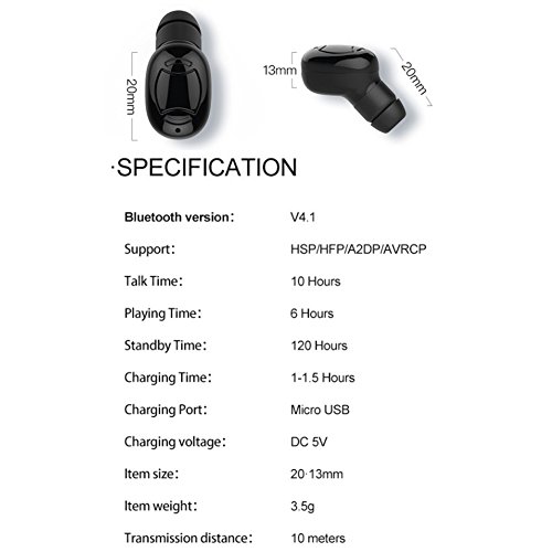 Specifications: Size: 14.25 * 13mm Weight : 3.5g Charging Time: 1.5 hours Music Time: 6 hours Talking Time: 10 hours Standby Time: 120 hours