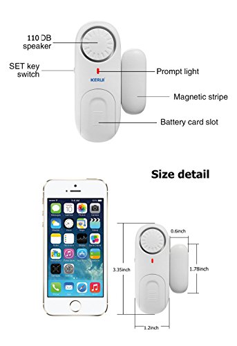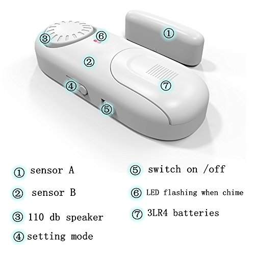 -. Feature : ✔SMALL & ENOUGH LOUD -A discreet design, Small body can also be used in more place such as window , door , gates,drawer, cabinets, even Rv's.Extremely loud up to 110 dB alarm, so loud that they make you instantly panic when you open the door by accident while it is set to alarm. Enjoy a sound night's sleep knowing that you and your family are protected. / ✔EASY TO INSTALL-Window /Door alarm comes with double sided tape (Superior adhesive backing for optimum sticking power.).It's easy for install and removal.Host come with 3 X LR44 new batteries, normally can last more than 6-8 months .You can change batteries by yourself. / ✔FIVE MODES TO CHOOSE- When security sensors are triggered, the system perform differently for different Modes (off/Nomal alarm/open prompt/open alarm/close prompt ).Bring more convenience and safety to your life.If you don't want it to work, you can turn it off . / ✔ALARMING WITH LED FLASHING-Once sensors triggered to active the alarm,the led indicator flash to tell you which sensor alarms .It will help you find the Exact Alarming Area Quickly, Especially at night. / ✔WARRANTY-Any question reply in 12 hours .Don't worry about quality and service . 100% service & warranty.